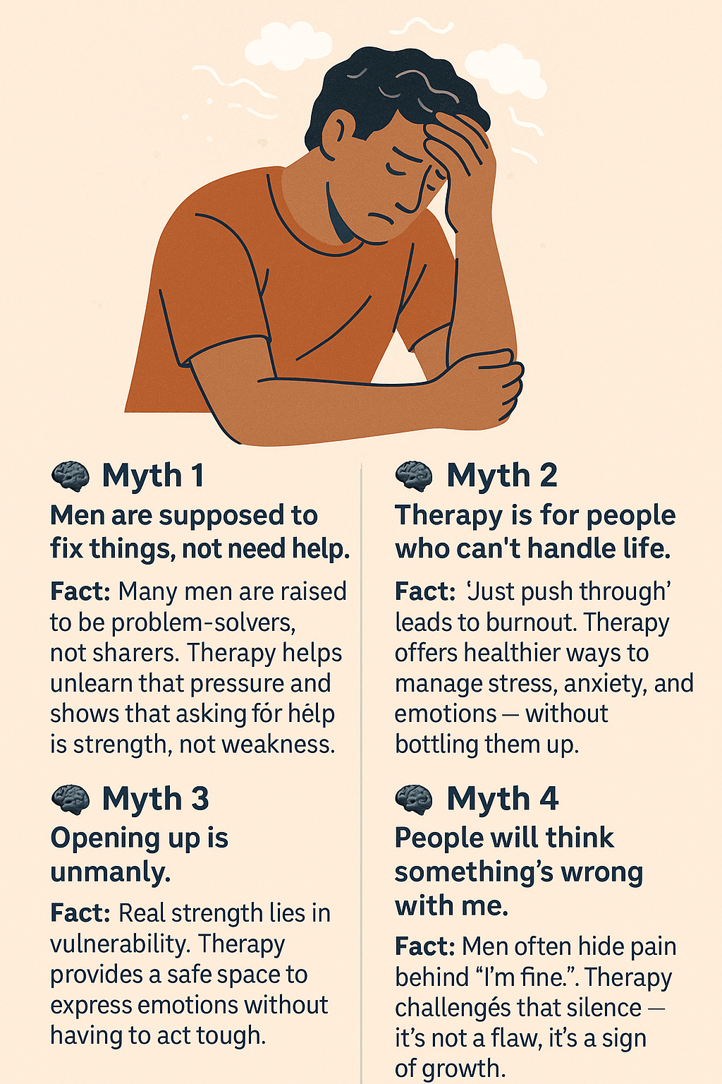 Staying silent takes a toll on daily life. Men who avoid support often face irritability, health issues, and strained relationships. Caleb may think he is protecting his loved ones by keeping quiet, but unspoken stress only creates distance. True strength lies in seeking help, not in pretending everything is fine. It is time to challenge the idea that men must carry their burdens alone. Counselling can help by focusing on managing stress and emotions, improving relationships, and building problem-solving strategies that support real change in everyday life.